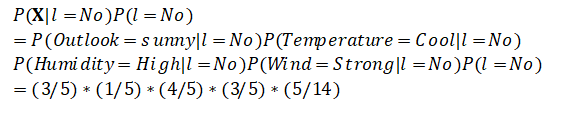 可以看出,类别l只有Yes和No两种情况。如果我们的测试样本X为(天气=Sunny,温度=Cool,湿度=high,风力=Strong),我们要分别计算出P(l=Yes|X)和P(l=No|X),然后比较大小,然后将概率大的那一方所选择的类别当作我们预测的结果。