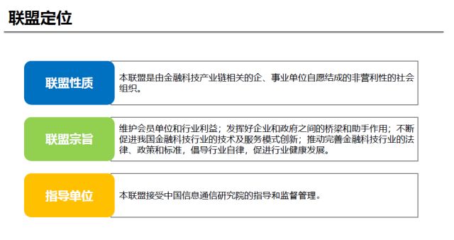 为助力《中国金融业信息技术“十三五”发展规划》、《新一代人工智能发展规划》、《银行业信息科技“十三五”发展规划》、《关于促进互联网金融健康发展的指导意见》等政策的宣贯,探讨行业规范,研究技术创新,搭建沟通桥梁,支撑政策编制,在相关部委的监督指导下,中国信息通信研究院筹备牵头成立“金融科技产业生态联盟”。