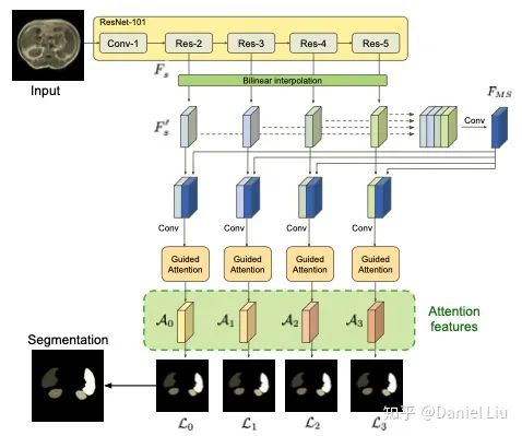 整个模型是基于ResNet-101进行的改进,Res-2, Res-3, Res-4, Res-5所生成的特征图F0,F1,F2, F3; 将他们通过线性插值的方式上采样到相同的尺寸,即F's. 讲所生成的F'0, F'1, F'2, F'3进行concate操作,而后进行卷积操作,生成多尺寸融合特征图FMS: