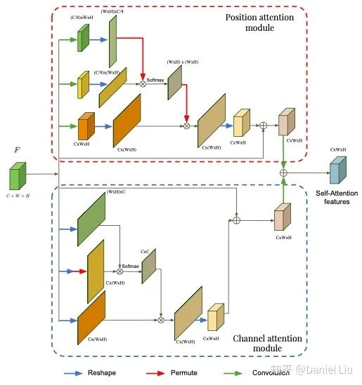 position attention module part:用于捕获长距离的依赖,解决局部感受野的问题。
