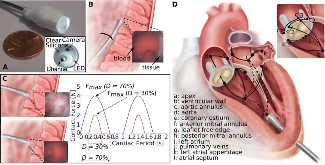 科学家说,是蟑螂和老鼠给了他们灵感。当然,也少不了机器学习算法的助力。一方面,机器人具有视觉处理能力。研究人员设计了一种基于机器学习的图像分类器,可以区分血液、心室壁组织和生物假体主动脉瓣膜,准确率高达97%;另一方面机器人具有蟑螂触角一样的触觉。研究人员在前端加入了“光须”(optical whisker),机器人可以像蟑螂用触角、老鼠用胡须探测物体一样,通过力的大小来计算导管前端与心脏内壁的距离。结合视觉、触觉两种感知能力,它可以在心脏内自动游走,寻找心脏瓣膜泄漏的位置。所以科学家们把它叫做“触觉视觉自主机器人”。