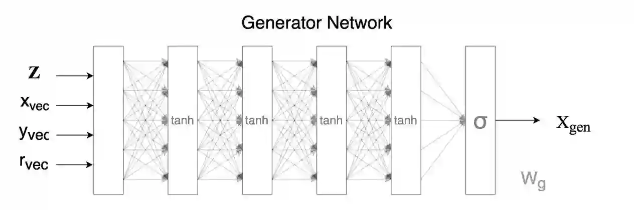 这个网络与上一篇文章中使用的网络属于一类。输入向量Z是从单位高斯随机数生成器中取得的32个实数组成的向量,这些实数均互相独立。向量x、y和r是我们想要计算的图像中的像素亮度的所有可能的坐标,因此对于26x26的图像,我们需要计算共计676个像素的亮度,以构成(32+676+676+676)个网络输入。有很重要的一点需要注意,每个像素强度将基于具有相同权重集合的完全相同的网络计算,所以如果内存有限的话,理论上我们也可以传给我们的网络(32+1+1+1)个输入并得到1个像素,在保持权重不变的前提下,重复这一步骤676次。
