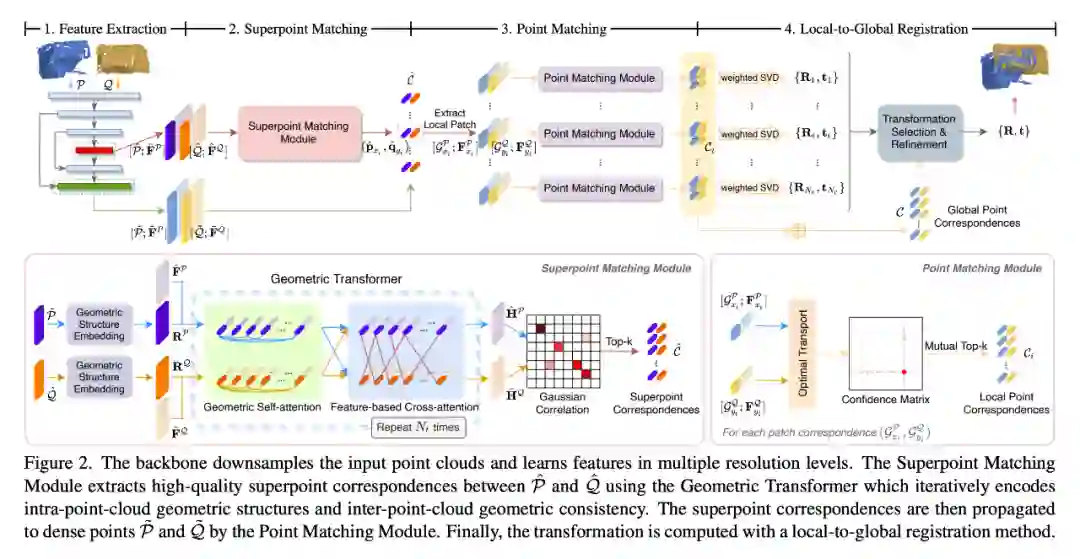 GeoTransformer 的整个算法分为四个部分。首先,对于输入点云,GeoTransformer 通过一个 KPConv backbone 来提特征。我们把最后一个分辨率下的点云所谓 superpoint,并通过 point-to-node 划分把每个点分配给最近的 superpoint,将 superpoint 扩展成 patch。