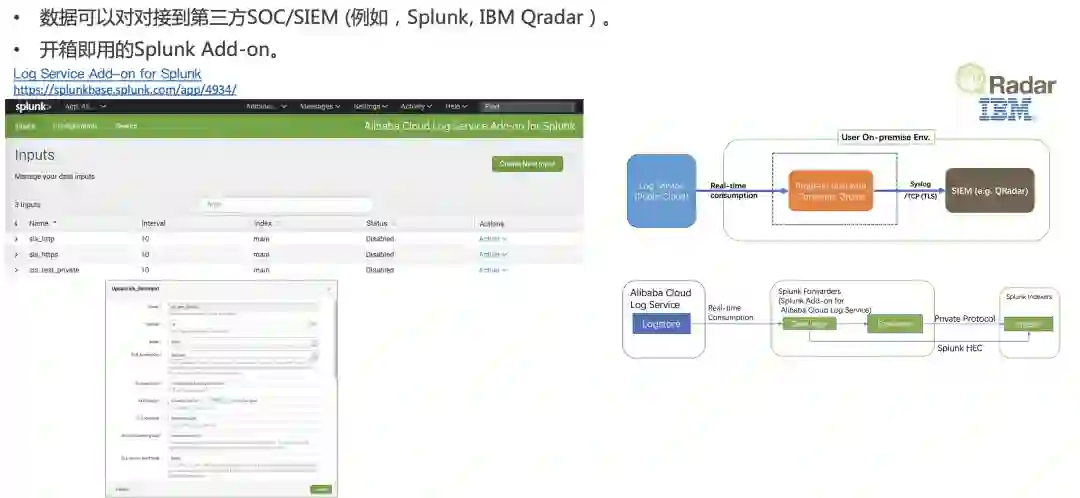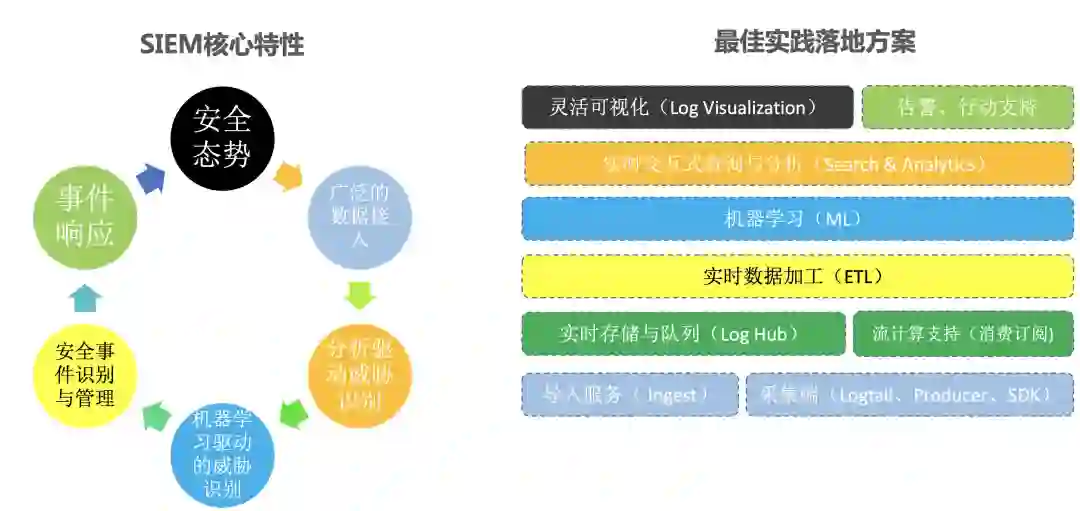 基于上文提到的SIEM平台化的思路,我们可以看到SIEM系统一些核心的特性(左图),而右图是我们最佳实践的落地方案。