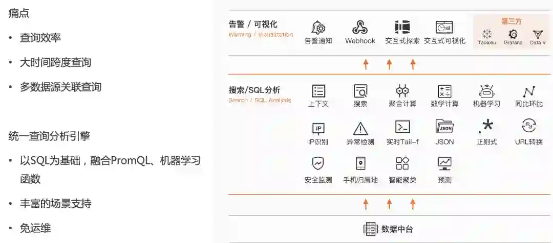 为了应对这些挑战,我们将日志、指标、Meta等数据全部接入到统一的存储中,在此之上,我们构建了一套统一的查询分析引擎,用于支撑查询分析、可视化、监控告警、AI 等上层能力。