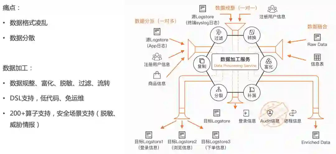数据加工服务可以对结构化或非结构化的日志进行实时的ETL处理。该功能目前包含200+算子,广泛应用于数据规整、数据聚合、富化、分发等场景。对于安全场景,数据加工也有很好的安全类算子支持。例如,数据加工提供的数据脱敏算子,可以有效地减少敏感数据在加工、传输、使用等环节中的暴露,降低敏感数据泄露的风险,保护用户权益。常见脱敏场景有为手机号、银行卡号、邮箱、IP、AK、身份证号网址、订单号、字符串等敏感信息脱敏。