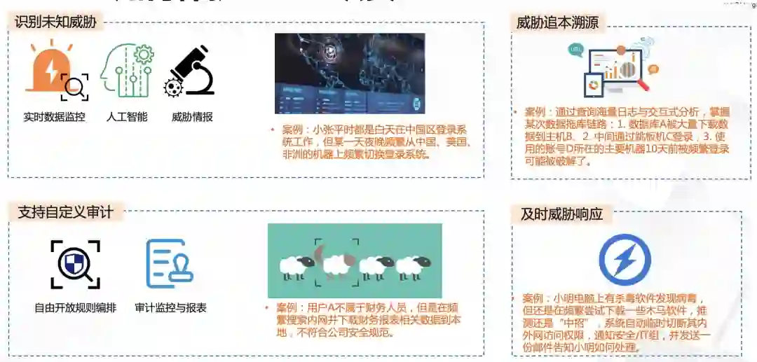 及时威胁响应:当威胁事件发生时,监控规则会将探测到的异常通过告警等形式通知给相关人员及时进行响应处理,形成问题闭环。
