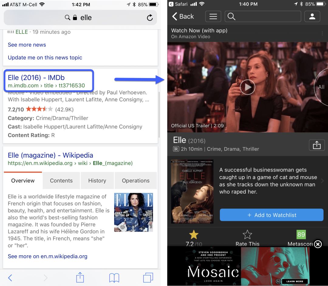 从iOS 9开始,移动网站和app间的切换变得更加简单,比如:我在搜索引擎中搜索了一个电影,一些结果将会自动打开对应的app页面(当用户已经下载了这些app)。