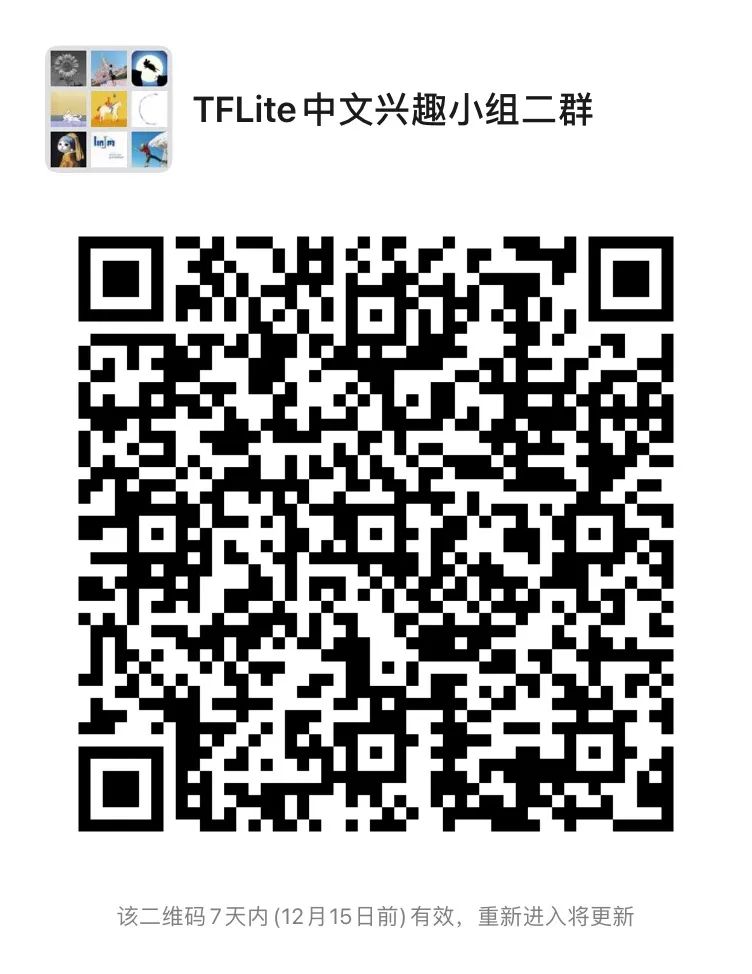 此外,我们已经在中国建立了 TFLite 特别兴趣小组,如果您有兴趣加入兴趣小组微信群请扫下面的二维码,如果过期或者群满请添加 ’hustwindmaple’ 手工拉入: