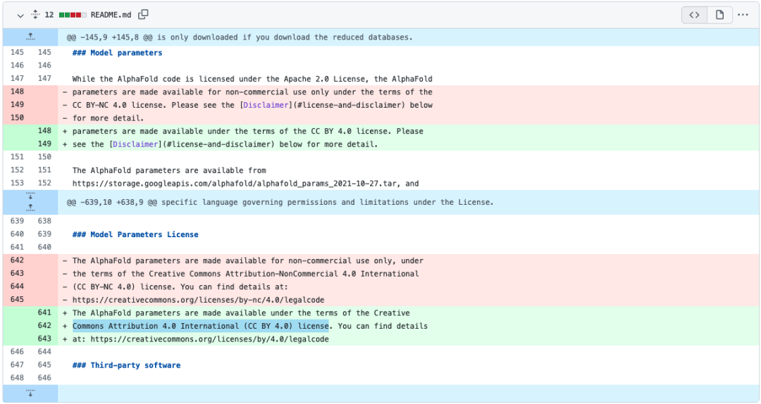 Google 旗下的人工智能 Deepmind 公司近期修改了 Alphafold2 的许可,当前“AlphaFold 参数根据知识共享署名 4.0 国际版(CC BY 4.0)许可条款提供”,而在之前 Alphafold 权重和数据仅在知识共享属性-非商业4.0国际(CC BY-NC 4.0)许可证的条款下可用于非商业用途。如今随着协议的更改,Alphafold2 也可以用于商业用途。