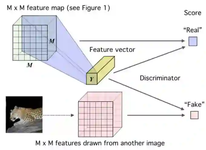 图 2:具有全局 MI(X; Y)目标的深度 INFOMAX(DIM)。研究者通过由额外的卷积层、flattening 层和全连接层组成的判别器来传递高级特征向量 Y 和低级 M×M 特征图(参见图 1)以获得分数。通过将相同的特征向量与来自另一图像的 M×M 特征图结合来绘制伪样本。