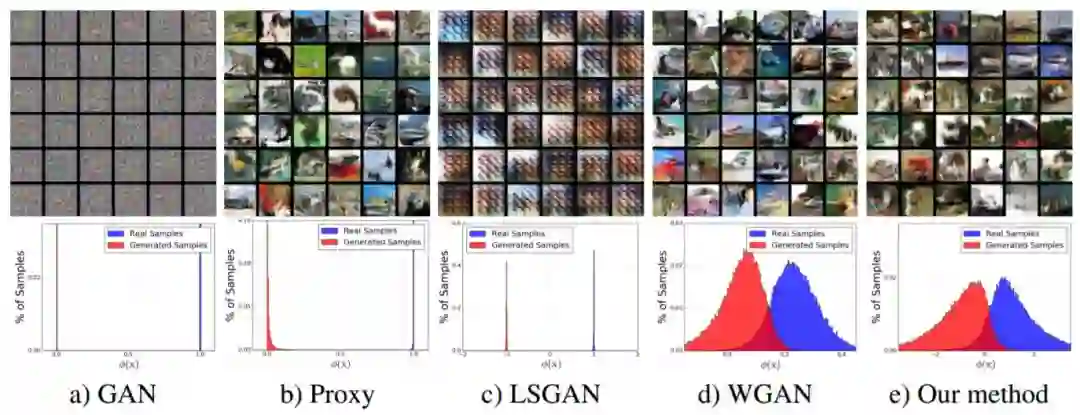 图 7:描绘判别器非归一化输出分布的直方图,分别是标准 GAN、具有-log D 损失的 GAN、最小二乘 GAN、Wasserstein GAN 以及作者提出的以 50:1 训练率训练的方法。