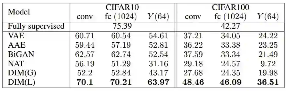 表 1:CIFAR10 和 CIFAR100 的分类准确率(top-1)结果。DIM(L)(仅局部目标)显著优于之前提出的所有其他无监督方法。此外,DIM(L)接近甚至超过具有类似架构的全监督分类器。具有全局目标的 DIM 表现与任务中的某些模型相似,但不如 CIFAR100 上的生成模型和 DIM(L)。表中提供全监督分类结果用于比较。