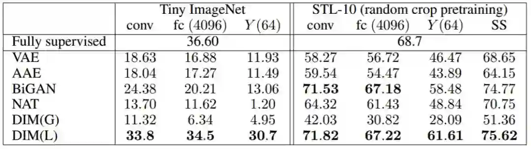 表 2:Tiny ImageNet 和 STL-10 的分类准确率(top-1)结果。对于 Tiny ImageNet,具有局部目标的 DIM 优于所有其他模型,并且接近全监督分类器的准确率,与此处使用的 AlexNet 架构类似。