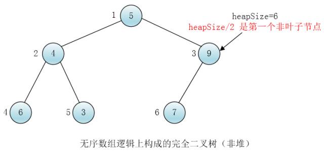 这里的 heapSize/2 就是第一个非叶子节点的下标