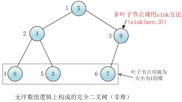 每个叶子节点可以视为一个大小为一的堆,我们可以自底向上从非叶子节点开始每层从右至左给每个节点都调用下沉(sink)方法,这样以当前节点为根节点的树就变为堆了