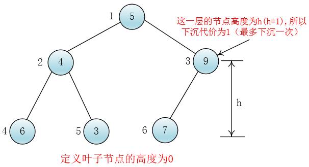 建堆的时候时间消耗在下沉操作上,而下沉操作最多下沉到底,显然,高度为h的节点下沉代价为O(h)