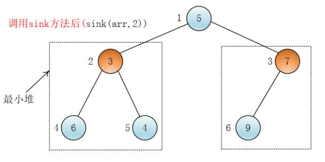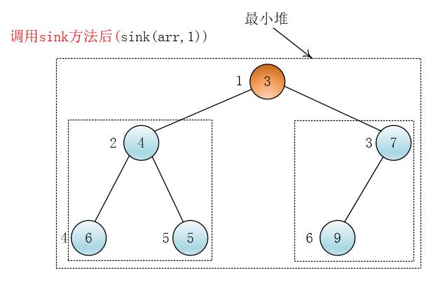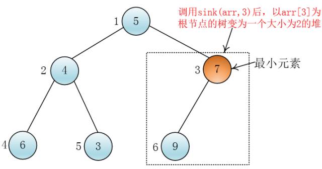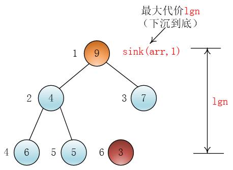 注意:在下沉(sink)某个节点的时候,这个节点的两个孩子必须是堆