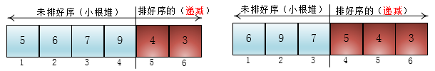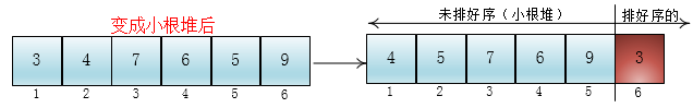 如果将这个数组调整为小根堆,那么根据小根堆堆顶一直是最小元素的特性,我可以不断地取(删除)堆顶的元素,直到堆中只剩下一个元素,这样就可以得到一个递减的元素序列了