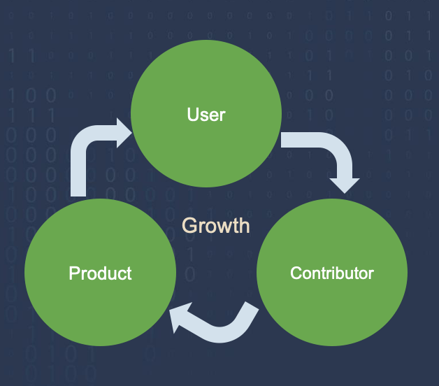 在项目早期,产品通常还是比较基础的状态,可能还没有什么用户,从长期发展的角度而言,这一阶段最关键的是验证和完善产品。早期的贡献者也通常是基于对产品技术本身的兴趣而加入,这也是为什么在图示中,存在双向的箭头。