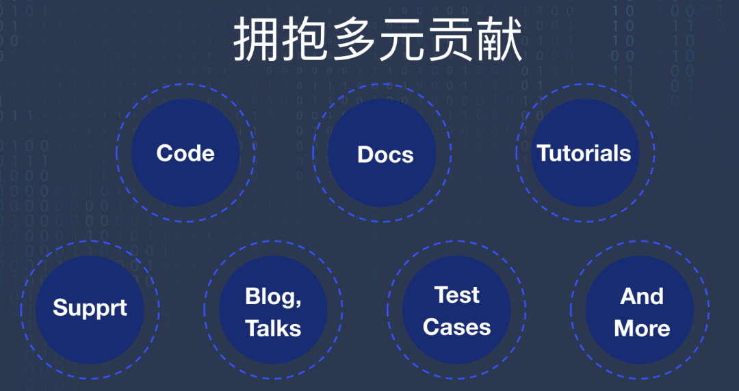 这里我们所称的“社区”,并不是狭义的贡献者社区,而是把我们的产品、贡献者、用户都视为社区的一部分,彼此之间相互影响,像一整个生态,而这个交互过程中的效率、质量都在影响着社区的成长。而“Contributor”也不仅包括代码贡献者,也包括了社区对文档、文章、答疑、布道等方面做出贡献的成员们。