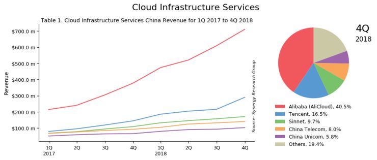 2017 Q1~2018 Q4中国云基础设施服务市场份额,来源:Synergy Research Group