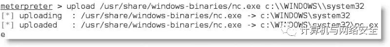 Netcat存储在Kali的/usr/share/windows-binaries库中。从内部meterpreter输入如下的命令,可以上传到被攻破系统中: