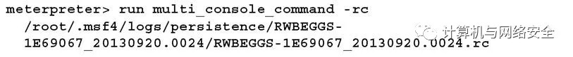因为persistence脚本没有经过认证,所有人都可以使用它访问被入侵系统;当发现或者渗透测试完成后,它应该从被入侵系统中立即删除。可以通过如下resource命令来删除脚本和确认资源文件的位置已被清理。