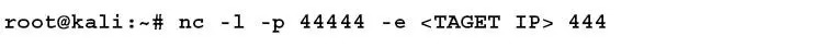该命令将调用Netcat(nc)来监听(-l)传入的流量,执行(-e)流量的转移动作到目标的444端口。端口并不固定,无论是监听/转发主机还是目标主机,端口不必相同。