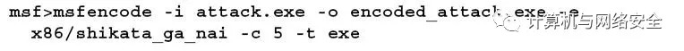 使用shikata_ga_nai协议,对attack.exe代理进行五次编码。每一次都是对上一次结果的重新编码,这样就更难侦测到。但是,可执行文件的大小也在增加。