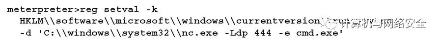 接着,用如下命令配置注册表,使系统开始运行,并启动Netcat;确保监听端口444(或者你选择的其他任何长期不被使用的端口):