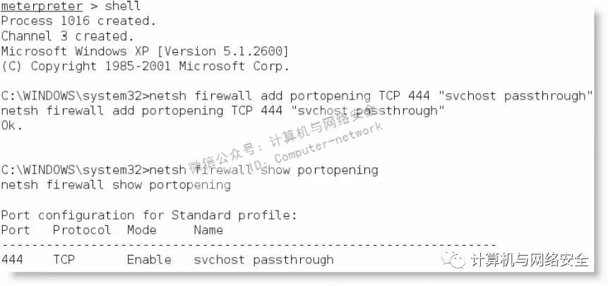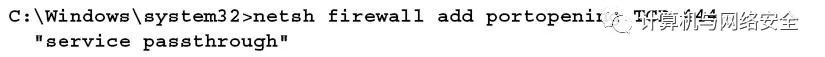 为了增加端口到本地防火墙,需要在meterpreter提示符后输入shell命令,然后使用适当的命令规则。当对规则进行命名时,比如svchostpassthrough,名字应该暗示此规则对系统的正常运行有重要作用。示例命令显示如下。