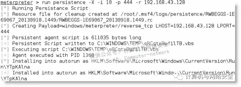 获得持久性,更有效的方法是在meterpreter提示符后输入persistence脚本。