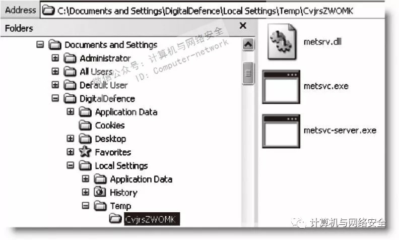 更重要的是,这不是一个隐蔽攻击。任何试图列举运行进程的命令,例如,在meterpreter提示符后输入ps,就可以识别metsvc服务;事实上,从Temp目录执行的命令是最可疑的。在下图中,Temp文件夹中带有随机名字(CvjrsZWOMK)的目录,这是系统被入侵的明显标志。