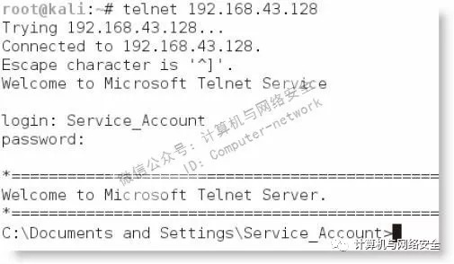 上图显示脚本在被入侵系统中,创建了一个持久的Telnet服务。为了访问它,需要用Telnet协议连接目标系统的IP地址,提供创建用户账户时输入的用户名和密码,如下图所示。