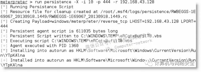 在系统被入侵后,迁移命令已经从最初的shell转移到一个更安全的服务,攻击者可以通过在meterpreter命令提示符后调用persistence脚本。