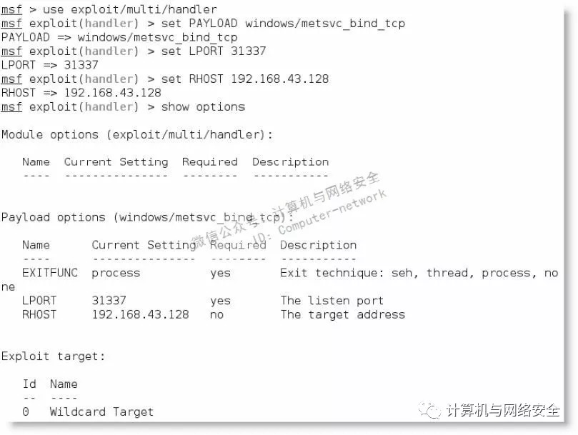 为了与持久metsvc代理交互,攻击者打开Metasploit框架,选择use exploit/multi/handler的windows/metsvc_bind_tcp作为有效载荷,如下图所示,同时设置其他参数(IP地址和端口)。