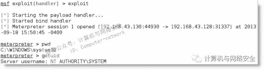 执行exploit命令后,在两个系统中直接打开一个会话,它允许提升权限,并实现其他从命令行启动的功能。exploit命令执行的结果如下图所示。