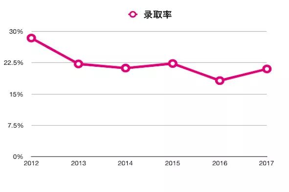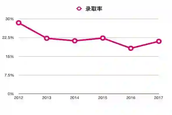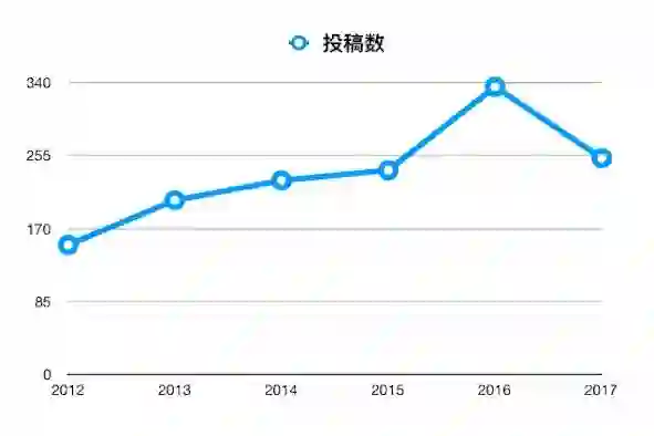 论文投稿逐年上升(受2016年18.2%低录取率的影响,2017年投稿数有所下降)