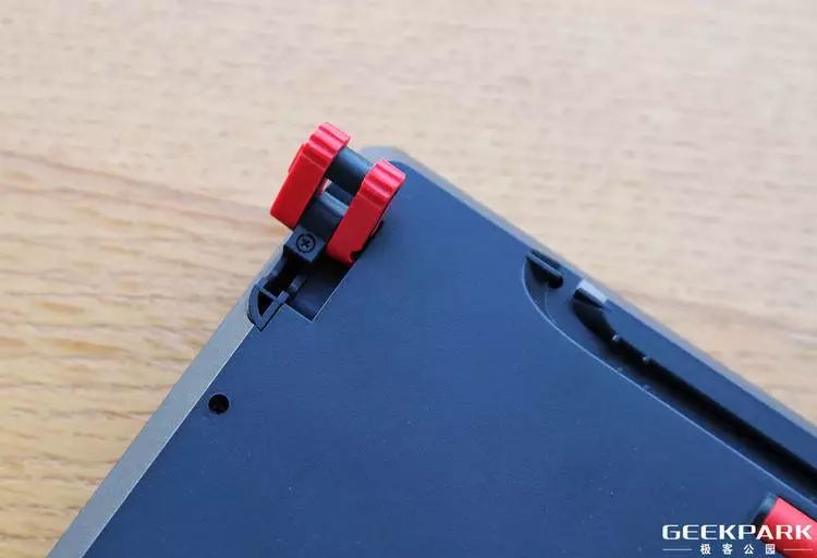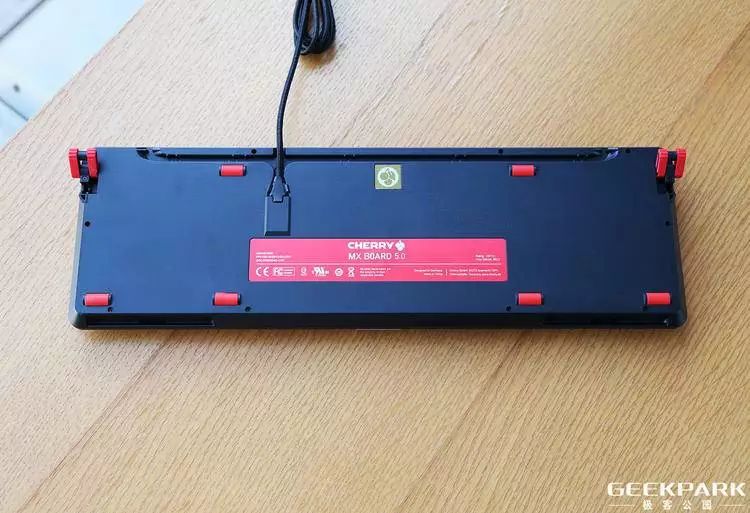 键盘底部左右各有一个红色支架。另外,除了其本身自带的支架之外,MX Board 5.0 还提供了一个非常大并且支持调节的掌托,按照官方的描述,其与独特的支脚搭配,可以实现 9 种不同的姿势状态。