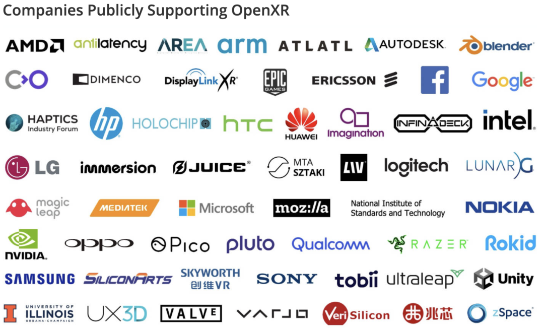 对于业界来说,OpenXR的出现相当于立起了一杆大旗。目前,OpenXR标准获得了包括AMD、Meta、谷歌、英特尔、微软、英伟达、高通等计算机软硬件和内容领域巨头的支持。