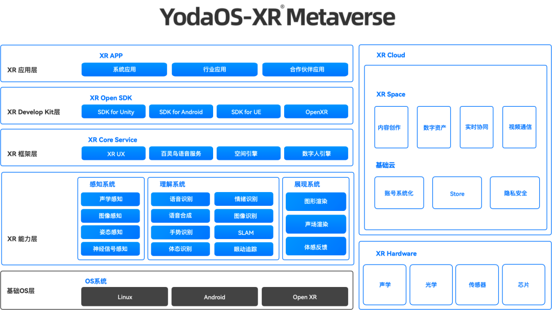 YodaOS-XR系统分为基础层、能力层、框架层、SDK层和应用层以及Cloud层,是一套端云一体的OS系统,系统层面技术成熟。