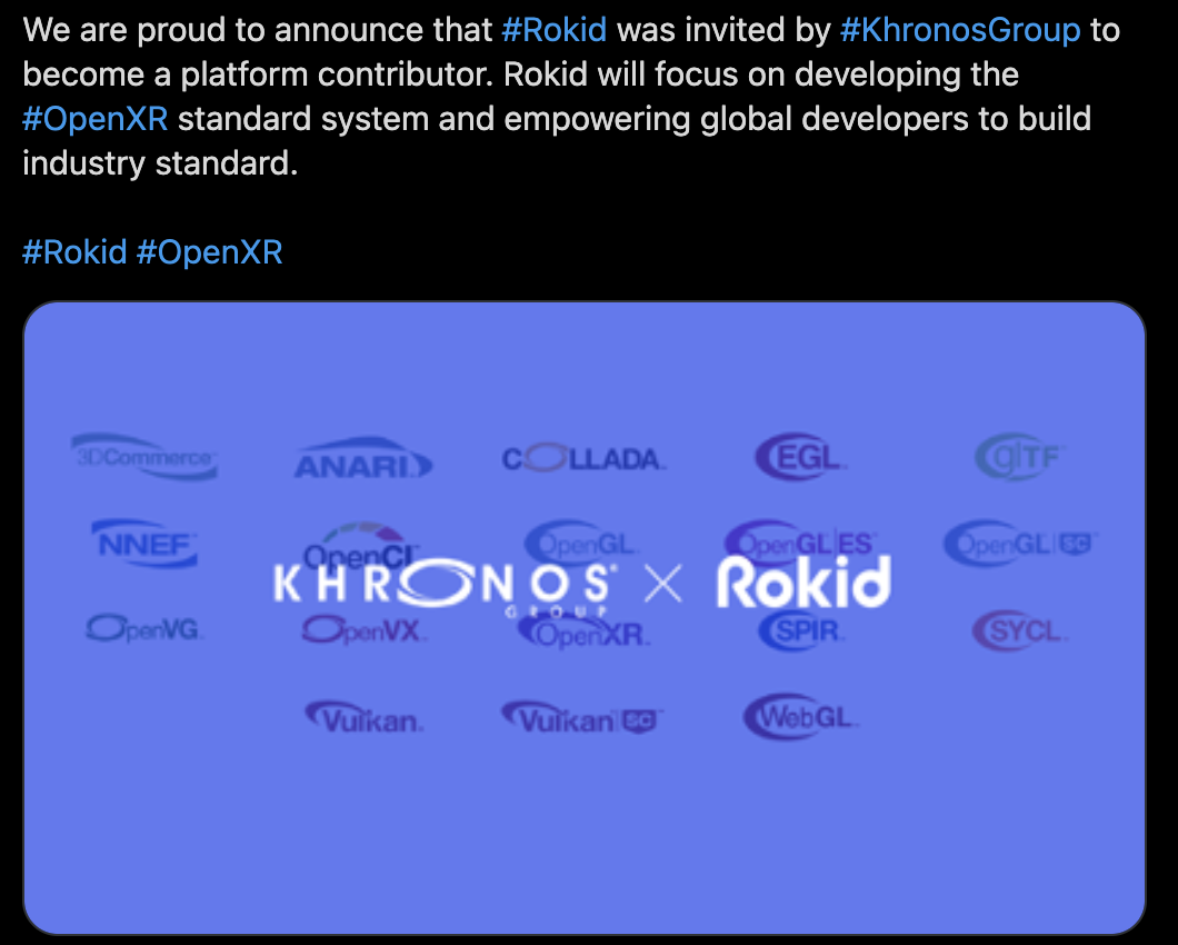 2021年11月,Rokid受到Khronos Group邀请成为了国内率先支持OpenXR的公司之一。