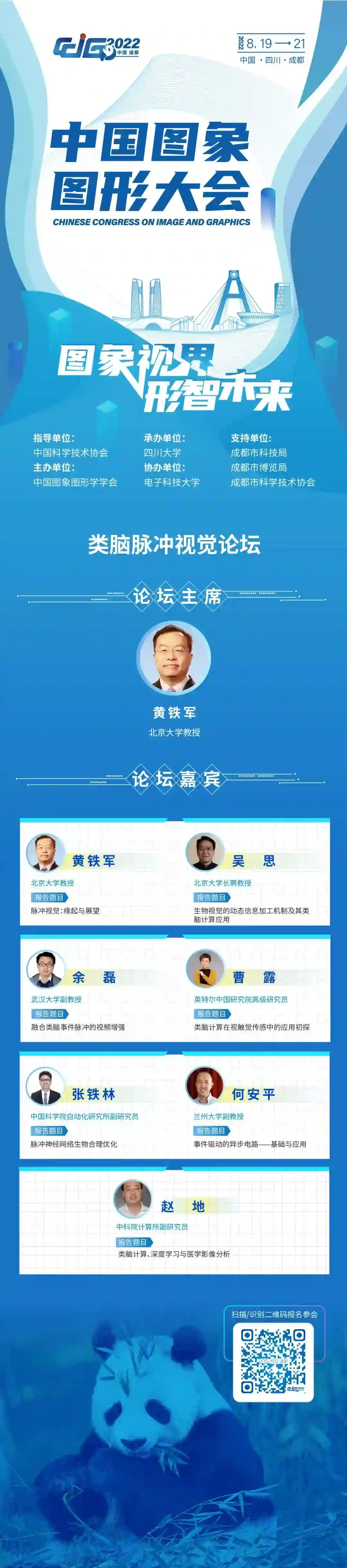 中国图象图形大会(CCIG 2022)将于2022年8月19-21日在成都盛大举办,大会以“图象视界,形智未来”为主题,由中国科学技术协会作为指导单位、中国图象图形学学会主办、四川大学承办、电子科技大学协办。