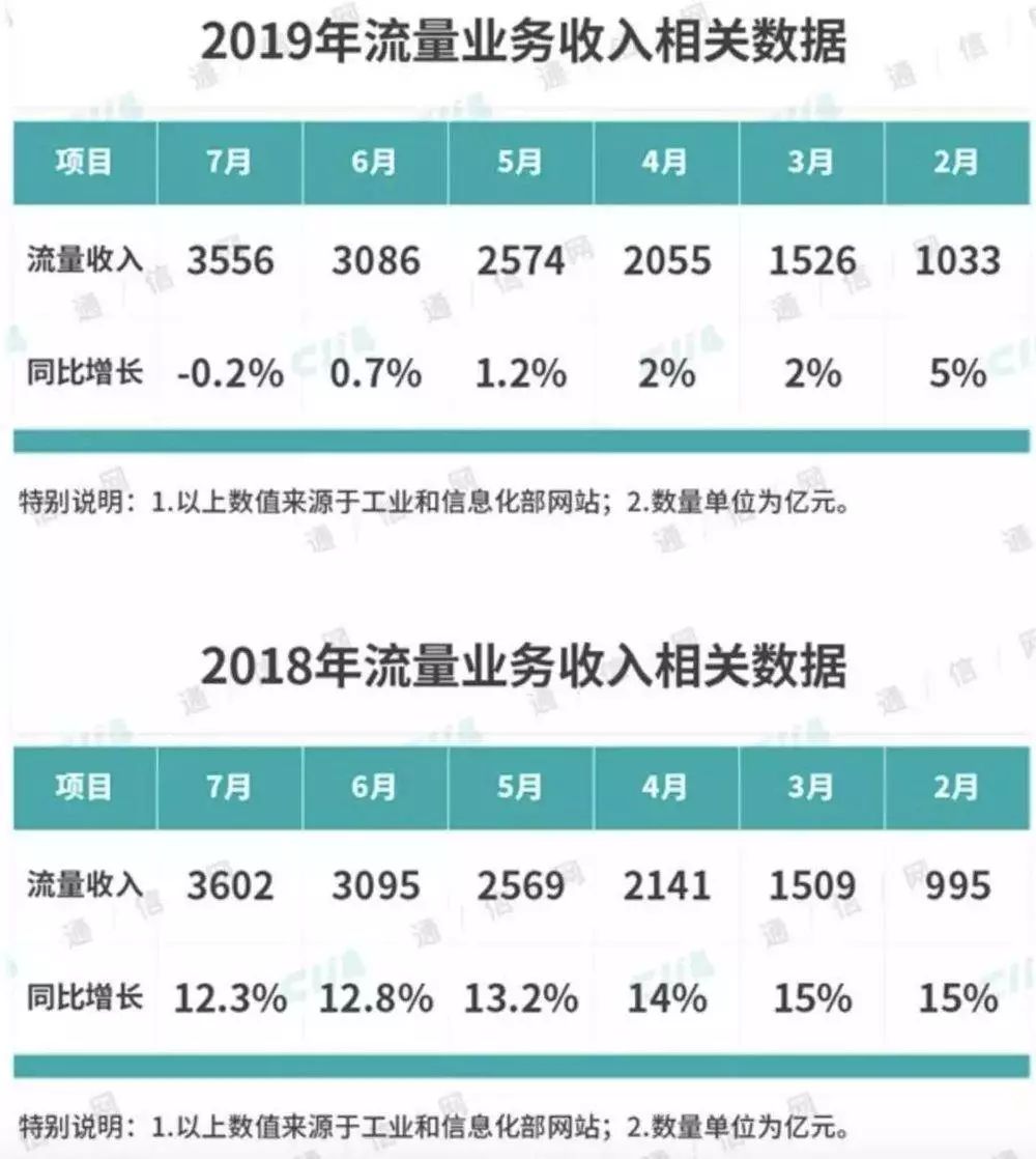 但对运营商而言,仅仅两年的发展,其流量收入已经从短期的高速增长转变为负增长。工业和信息化部公布的《2019年1-7月通信业经济运行情况》显示,1-7月,三家基础电信企业完成移动数据及互联网业务收入3556亿元,同比下降0.2%,在电信业务收入中占45.7%。