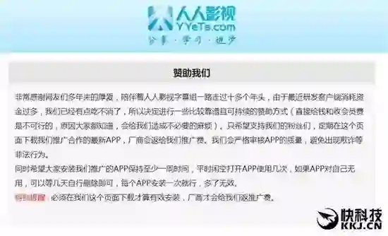 人人影视昨天通过官方网站、微博发帖称“人人影视需要您的帮助”,并透露这大半年来一直在努力开发客户端,但是太烧钱了,已经把储备金挥霍一空。人人影视希望能找到一种比较靠谱的、可持续的赞助模式,从而继续获得资金,研发客户端,以及购买服务器来改善速度问题。