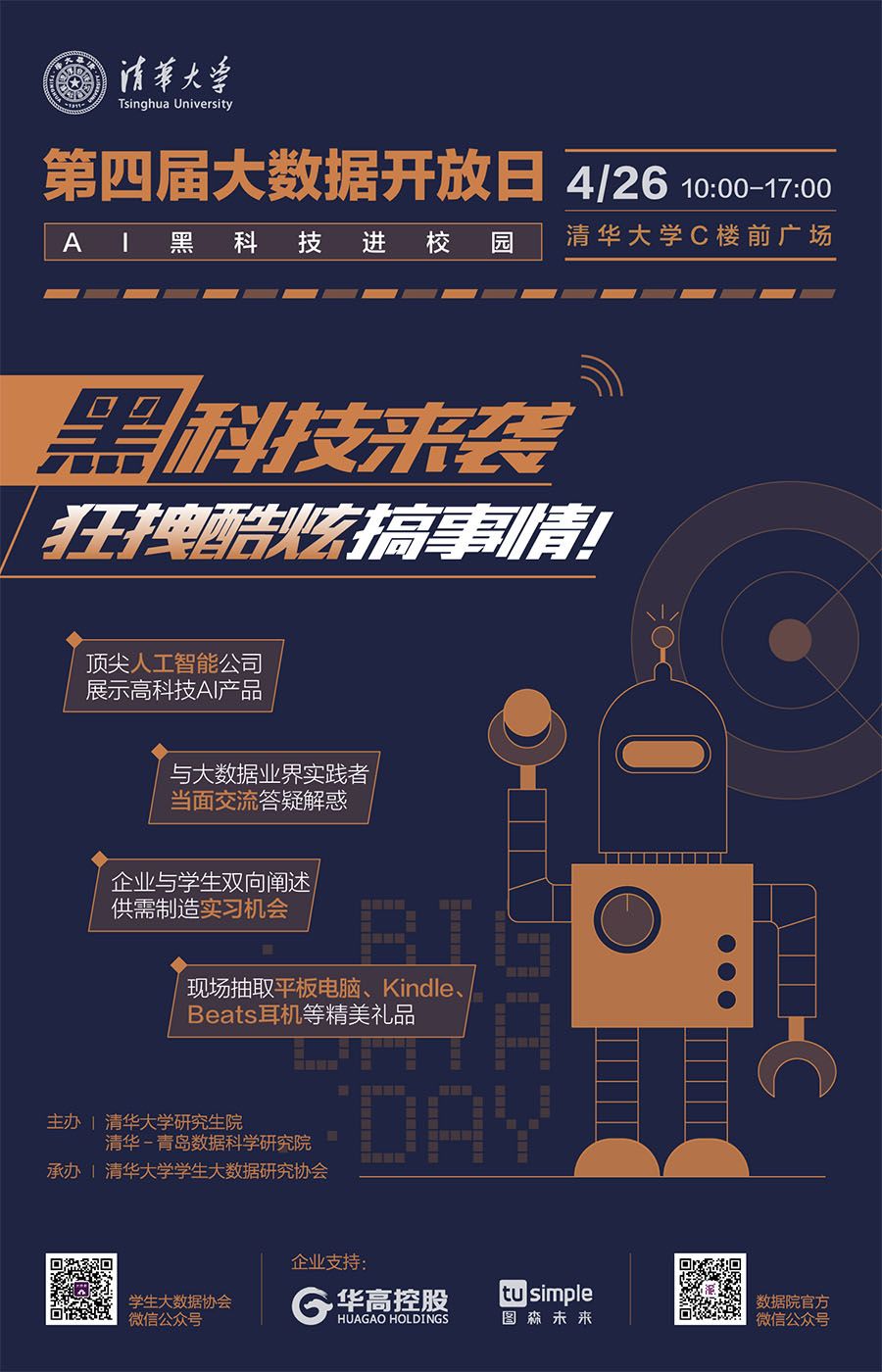 在清华大学107周年校庆、清华-青岛数据科学研究院成立4周年之际,为了让校内外师生更加了解大数据,领略大数据的魅力,数据院联合校研究生院于2018年4月26日举办“清华大学第四届大数据开放日(Big Data Day)”活动。