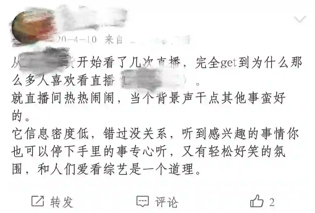 有网友说,这个浮躁的年代,QQ成了摆设,微信只有工作,信息接收快递,电话只有诈骗。外面的世界车水马龙,回到家却发现只剩孤寂,电视机已经很久没有打开过了,想看点什么剧却又不知道从何看起。此时此刻,打开直播间,还能给空荡荡的家里增加一丝人气。