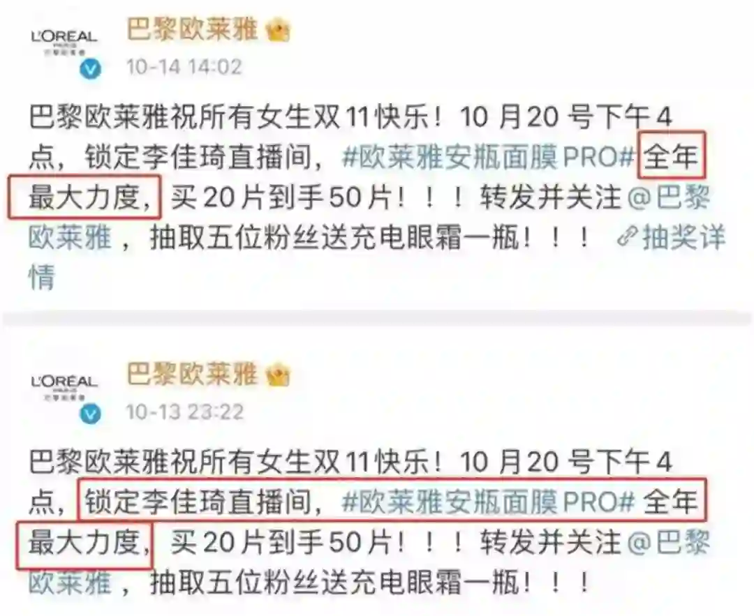欧莱雅曾在微博公开表示李佳琦和薇娅这两大头部主播直播间的价格将是“全年最大力度”,可网友却发现品牌官方直播间更加便宜。